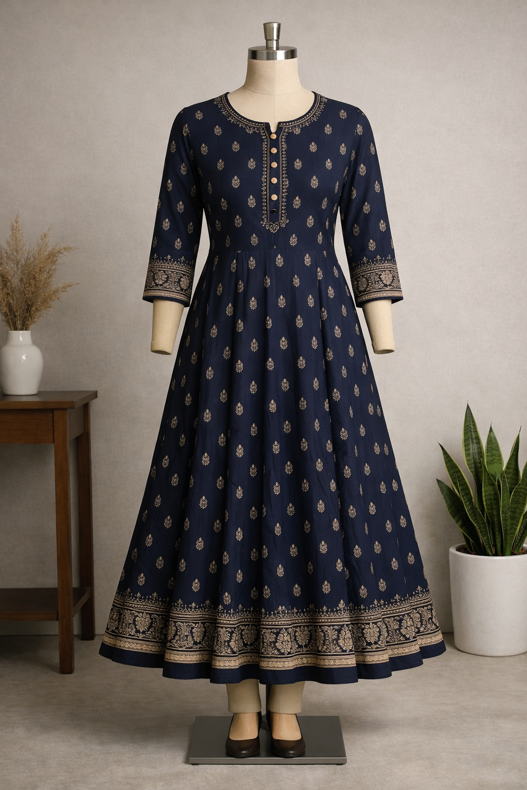 A timeless Anarkali silhouette designed to flow gracefully from the waist, offering elegance and comfort in every movement. Available with panels for added flare and structure or without panels for a smooth, minimal look, this style adapts effortlessly to both everyday wear and special occasions. Crafted for comfort with a refined finish, it is a versatile choice for modern and traditional wardrobes alike.