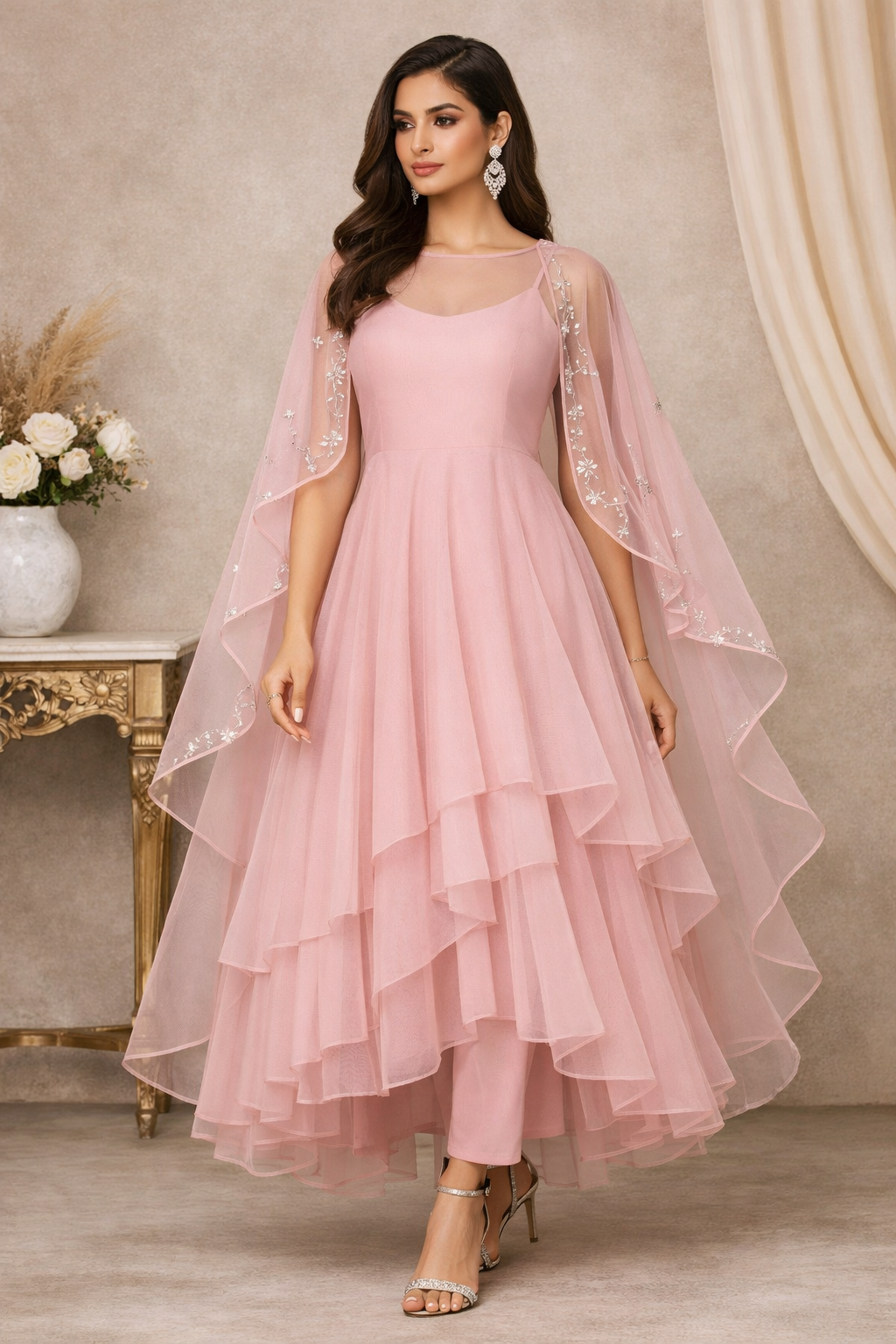 A contemporary Cape Style Anarkali featuring a graceful Anarkali base with a sheer cape overlay, designed for modern, fashion-forward women. The cape creates a high-impact look while keeping the silhouette light and elegant , this style is perfect for stylish buyers who love refined statement outfits.