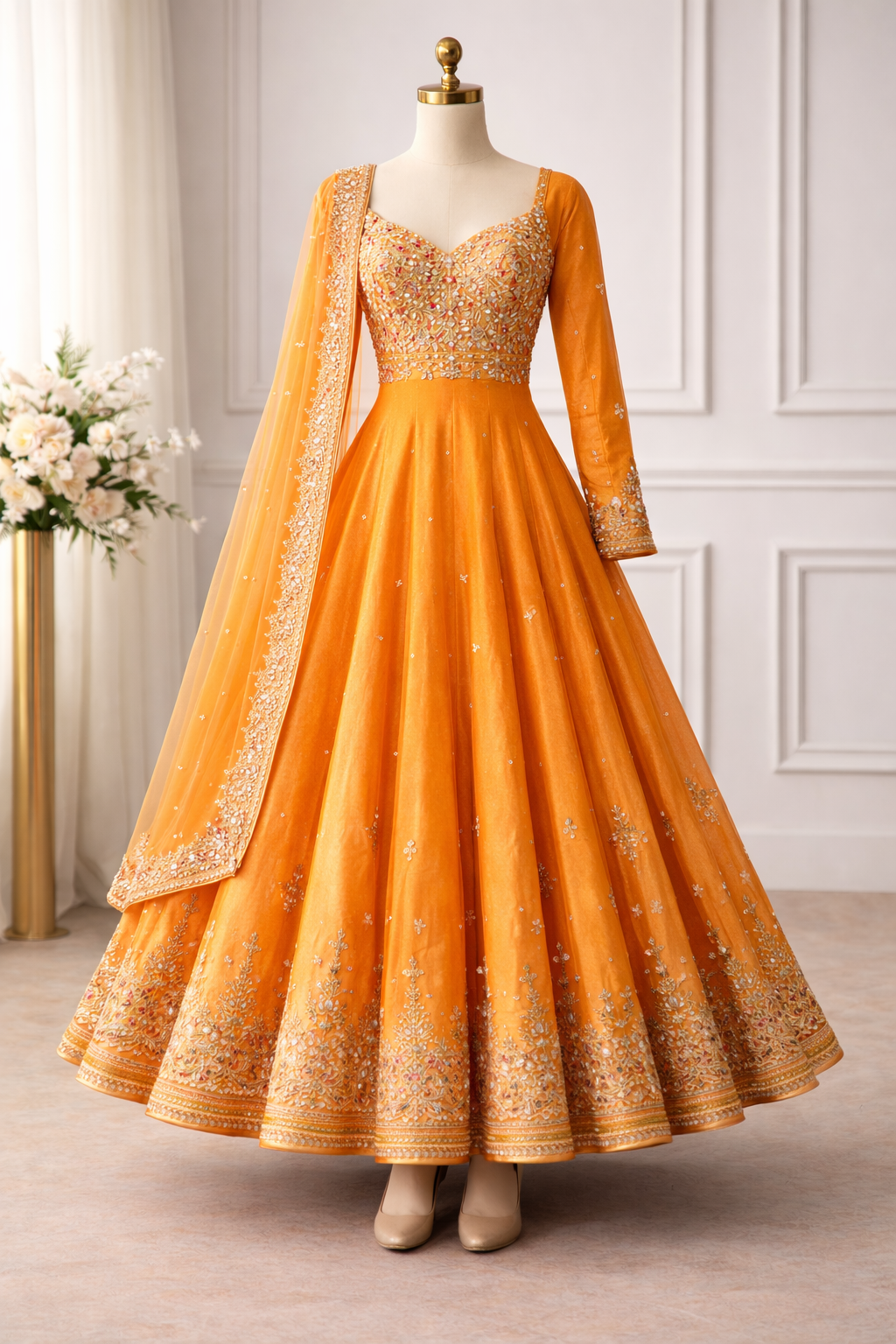 A graceful Full Length / Leg Length Circular Anarkali designed for elegance and movement. Crafted with a beautifully flared silhouette that flows , this outfit creates a royal look with every step. Making it perfect for festive occasions, weddings, and special celebrations ,casual or formal