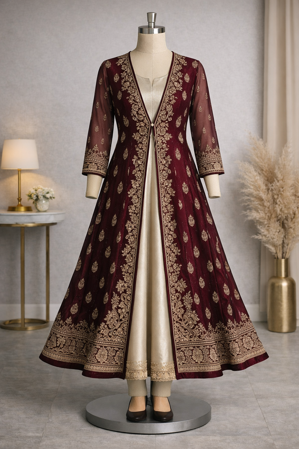 A graceful inner Anarkali paired with anjacket, offering a refined Indo-western look. Crafted with a inner sleevless anarkali and outter long jacket , this premium ensemble is perfect for receptions and special occasions.
