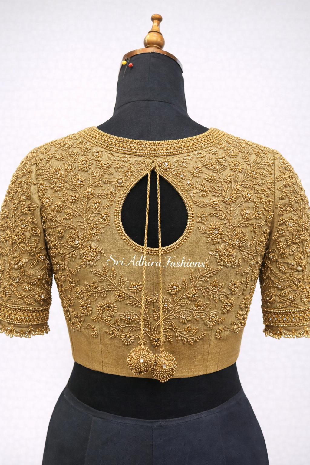 Handcrafted blouse with intricate Aari embroidery, bead and stone embellishments, elegant back-tie detailing and rich sleeve work — perfect for bridal, reception and special occasion wear. Made to order with complete design and measurement customisation.