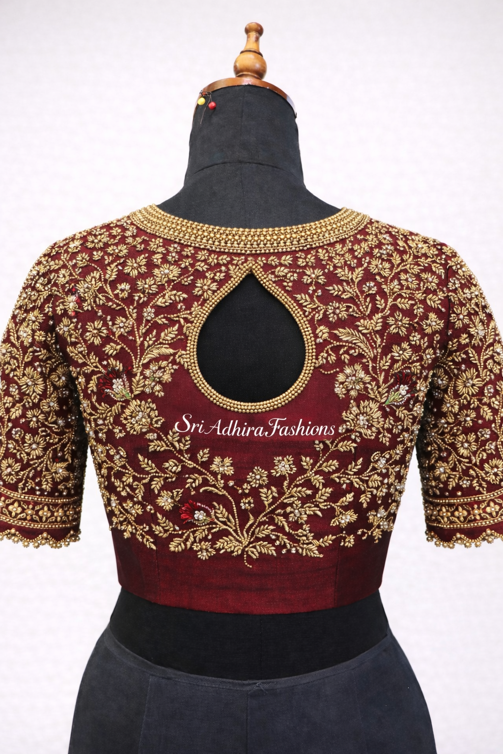 Premium handcrafted blouse with dense Aari embroidery, floral motifs, bead and stone embellishments, and elegant back-cut detailing — ideal for bridal, reception and festive wear. Made to order with complete design and measurement customisation.