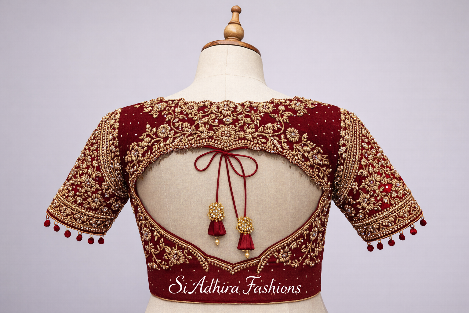 This exclusive handcrafted designer blouse features rich Aari and Zardosi embroidery with intricate floral motifs, beadwork, pearls and premium thread detailing across the back and sleeves. The elegant cut-out back with handcrafted dori tassels adds a graceful and contemporary finish, making it ideal for weddings, receptions, engagements and grand occasions.