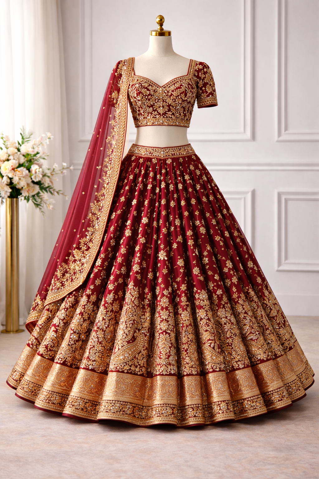 This bridal lehenga showcases intricate hand Aari embroidery, presented in a flat layout to clearly highlight every design element. Crafted on rich maroon fabric, each detail reflects traditional craftsmanship and luxury bridal finishing.