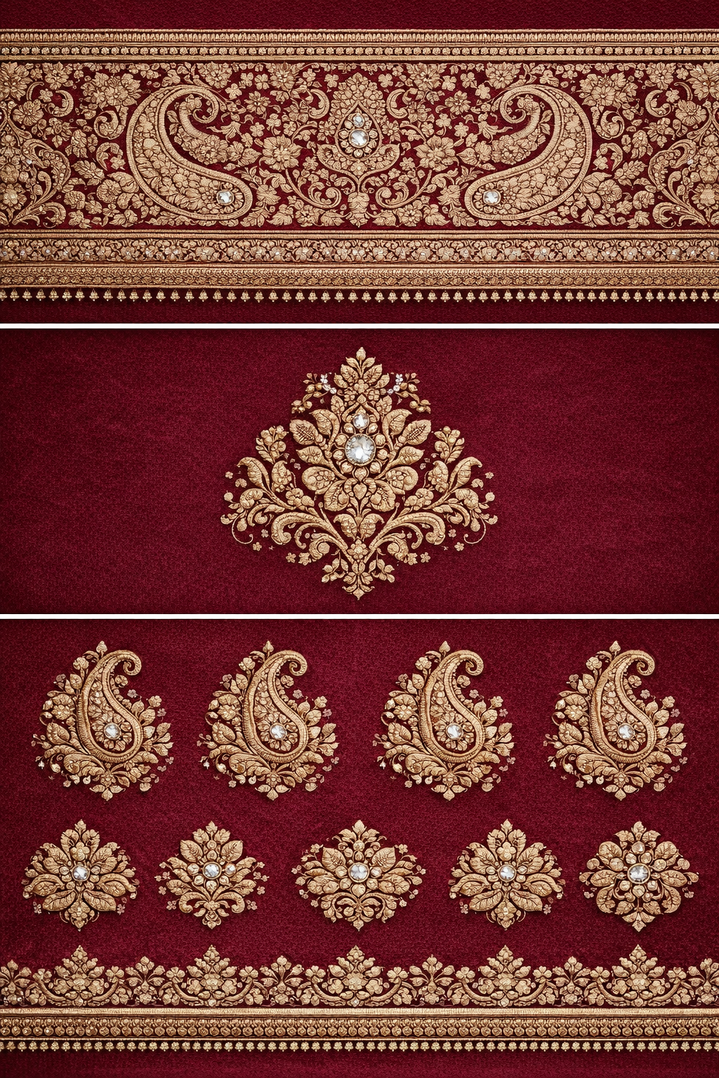 - Wide, heavy bridal border with paisley and floral vines