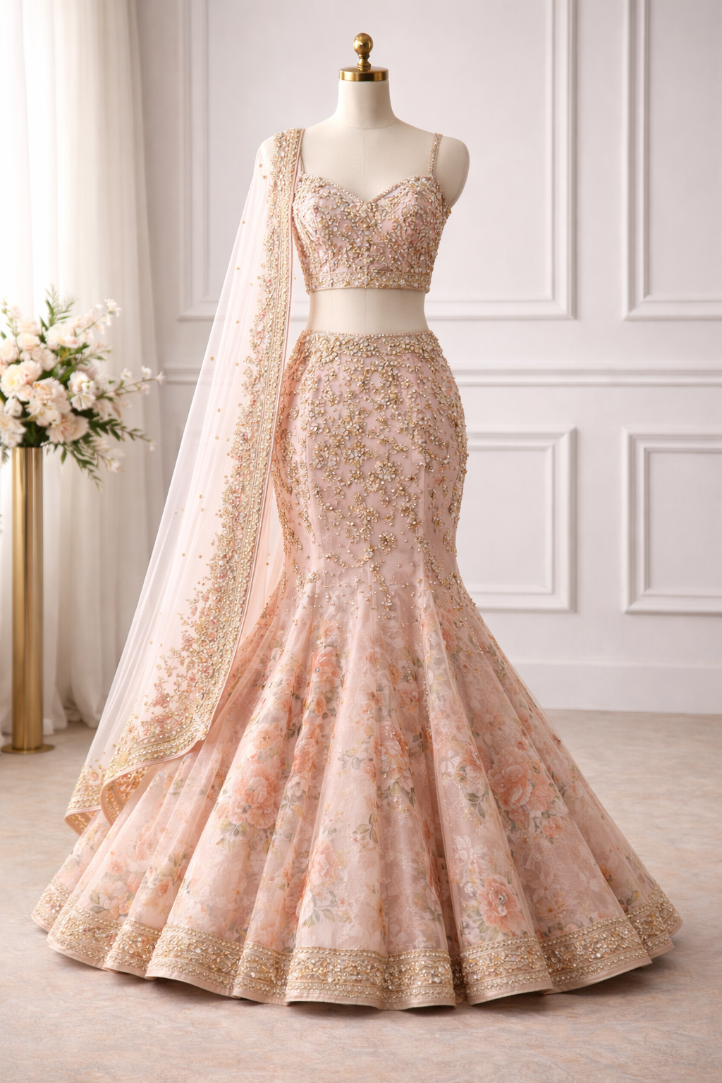 Crafted to your measurements and style preferences, this fully customised mermaid lehenga blends modern elegance with couture-level fit—exclusively created at Sri Adhira Fashions.