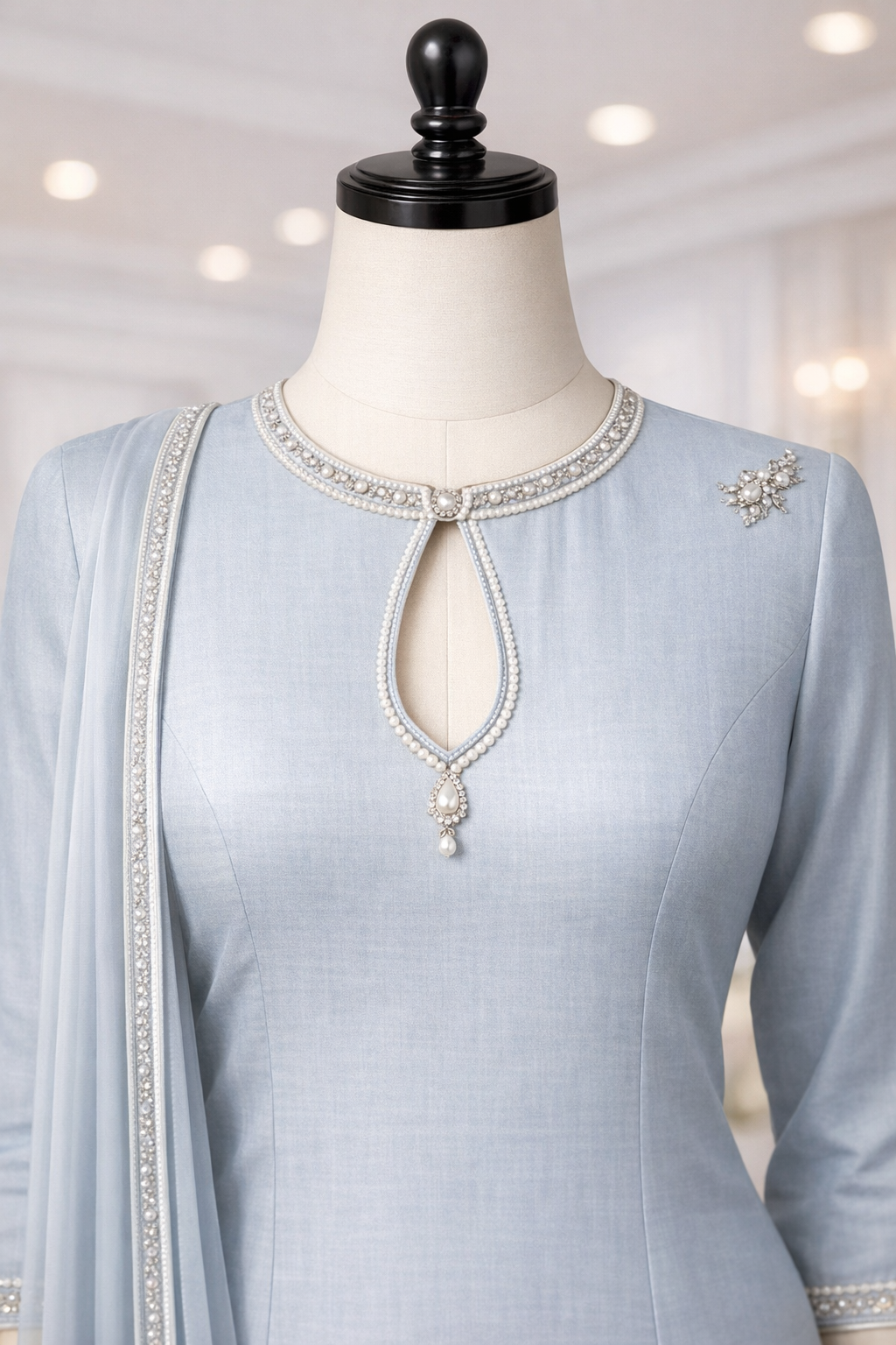 Perfect for corporate suits, formal salwar sets, and premium everyday work attire, this keyhole neck blends modern sophistication with timeless simplicity.