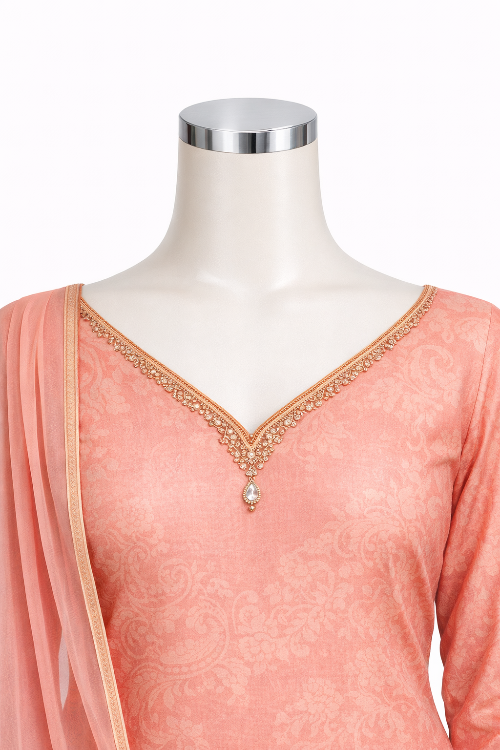 Elevate your salwar style with our premium V neckline, crafted to give a sharp, elegant, and beautifully elongated look. This luxurious neckline features:
